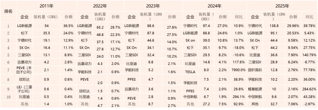 根据SNE数据,海外动力电池企业装机量格局经历了显著的代际更迭:2011一2023年,LG新能源、松下等韩日企业长期占据主导地位,LG新能源连续12年位居榜首,2023年份额达27.8%;2024年起,宁德时代凭借全球化布局反超登顶,2025年装机量达138.8GWh,份额提升至29.96%,成为海外市场新龙头。比亚迪则在2025年跃升至第5位,同比增速高达140.79%,展现出强劲的增长势能;而松下、三星SD1等传统韩日企业份额有所收缩,中创新航、国轩高科、孚能科技等中国企业则凭借技术与成本优势快速崛起,推动海外市场格局从“韩日主导”向“中企引领、多元竞争”加速转变。