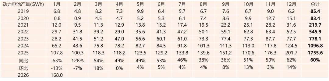 根据动力电池联盟数据,中国动力电池产量规模呈现爆发式增长:年度总产量从2019年的85.4 GWh跃升至2025年的1755.6GWh,六年内增长超20倍,2025年同比增速达60%,显示出行业强劲的扩张动能。月度维度上,产星自2021年起持续攀升2025年各月产量均突破100 GWh,12月单月产量达201.7 GWh,且月度同比增速始终维持在36%以上,环比也保持稳步增长,反映出在新能源汽车渗透率提升与储能市场爆发的双重驱动下,中国动力电池产能利用率与产量释放节奏持续加快,行业规模效应与供给能力不断增强。