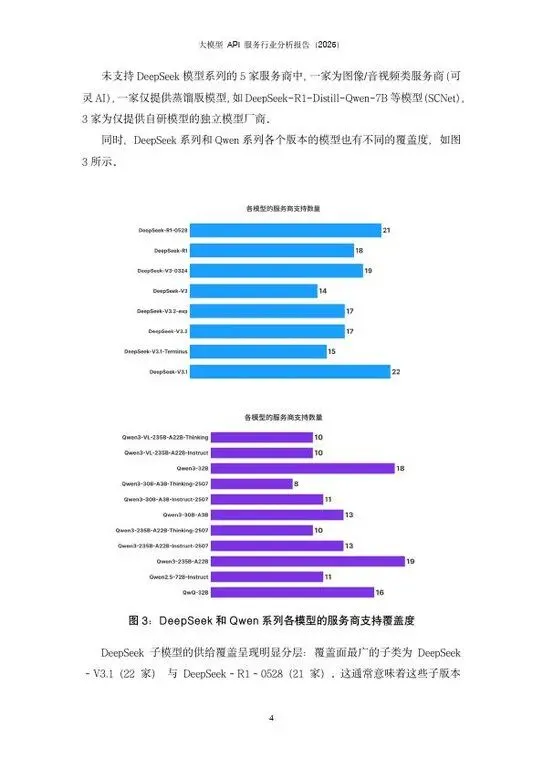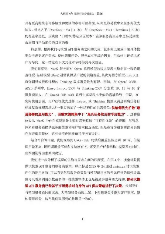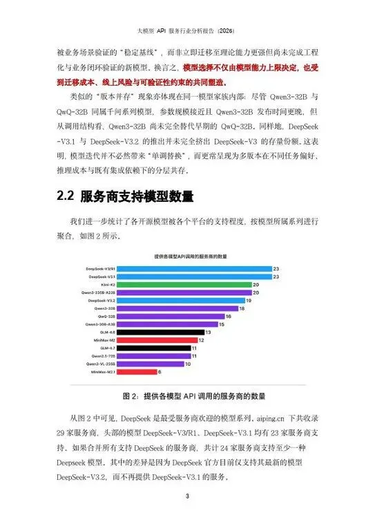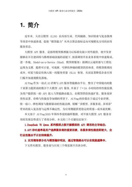近年来,大语言模型(LLM)在内容生成、代码辅助、知识检索与复杂推理等场景中快速渗透,促使“模型能力”从单点算法指标走向可规模化交付的在线服务形态。大模型 API 服务,是指将模型推理能力以标准化接口对外提供,使开发者能够在不自建训练与推理基础设施的前提下,按需调用并在业务系统中快速集成。进一步地,Model-as-a-Service(MaaS,模型即服务)强调以云端资源与工程化运维为支撑,提供可计量、可观测、可弹性伸缩的模型供给体系,将模型推理的成本、时延与稳定性纳入统一的服务质量(SLA)框架,从而显著降低企业应用门槛并加速规模化落地。AI Ping 作为一站式AI评测与API服务智能路由平台,整合了中国境内的数十家算力提供商的数百个大模型 API 服务,并基于 7×24 小时的持续性能监测,为用户提供统一的 API 接入与智能路由能力。在模型供给快速扩张、服务商异质性显著、价格与性能竞争加剧的背景下,AIPing的价值在于通过专业评测、统一接口、弹性调度与数据驱动的性能治理,缓解“多模型、多服务商、多场景”带来的接入复杂度与运维不确定性,为应用侧提供更稳定的质量—成本最优解。本文基于 AIPing2025年第四季度的抽样数据,对开源大模型 API 服务市场的发展态势进行了系统分析。本文的三个关键结论如下:1. DeepSeek 与 Qwen 系列模型占据开源模型的 API 调用的主导地位;2. API 吞吐速率是用户选择服务商的重要因素,各服务商性能差距较大,全行业性能水平正在持续提升;3. 应用侧场景分化与模型偏好明显,通过智能路由可以有效提速降本。下文将从模型、服务商与应用三个维度展开具体分析。以上资料均从网络公开资料收集整理而成,所有报告版权归原公司、机构所有!如有侵权请留言联系我们,我们将第一时间处理。