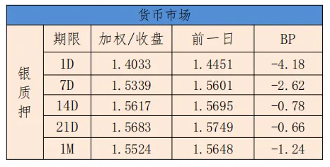 今日银行间市场主要回购利率整体下行。隔夜加权平均利率收盘于1.4033%,上日的收盘价为1.4451%,下行4.18BP;14天收盘价为1.5617%,相比较昨天的收盘价格1.5595%,下行0.78BP。