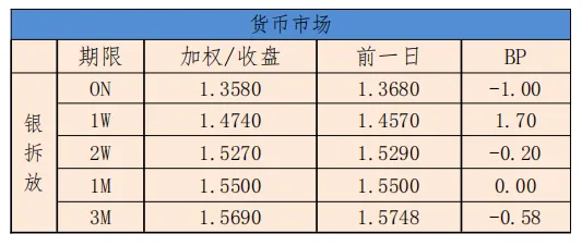 今日上海银行间同业拆放利率(Shibor)整体下行。隔夜Shibor下行1.00BP,报1.3580%。7天期Shibor上行1.70BP,报1.4740%,1个月Shibor稳定至0.00BP,报1.5500%。
