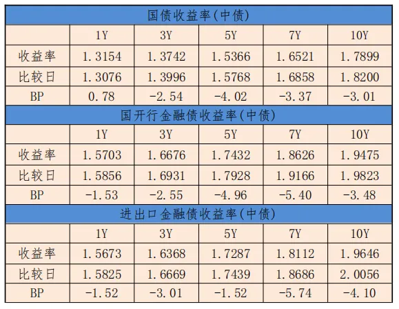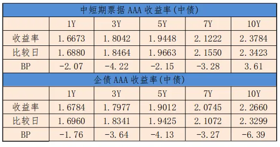 中债中短期票据收益率曲线(AAA)1年期收益率下行2.07BP,至1.6673%,3年期收益率下行4.22BP,至1.8042%。