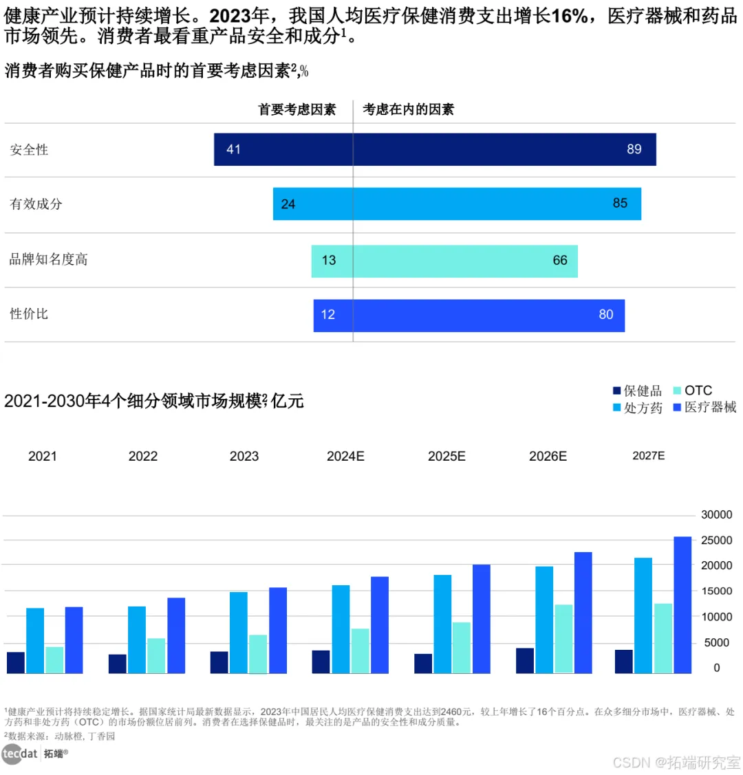 健康产业的发展前景看好,预计将实现长期稳健的增长。国家统计局发布的最新数据显示,2023年我国居民在医疗保健方面的人均支出为2460元,与前一年相比,增长率达到了16%。在众多健康产业的细分市场中,医疗器械、处方药和非处方药(OTC)的市场份额显著,位列前三强。消费者在购买保健产品时,最为关注的是产品的安全性和成分的纯净性,这两个因素成为他们决策过程中的首要考量。