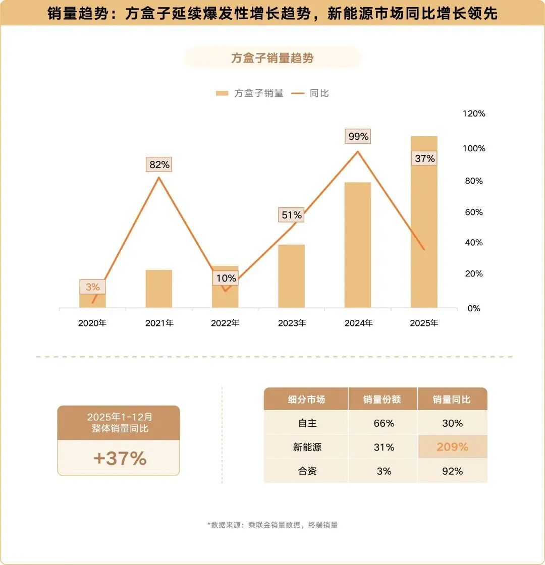 从以往进口高端的小众“硬核玩具”,到坦克300引爆国产方盒子市场实现破圈传播,如今国产方盒子借助新能源技术实现演变为大众个性消费品;2025年中国方盒子市场销量延续爆发式增长趋势,呈现“多点开花”趋势,市场结构向电动化、场景泛化演化;