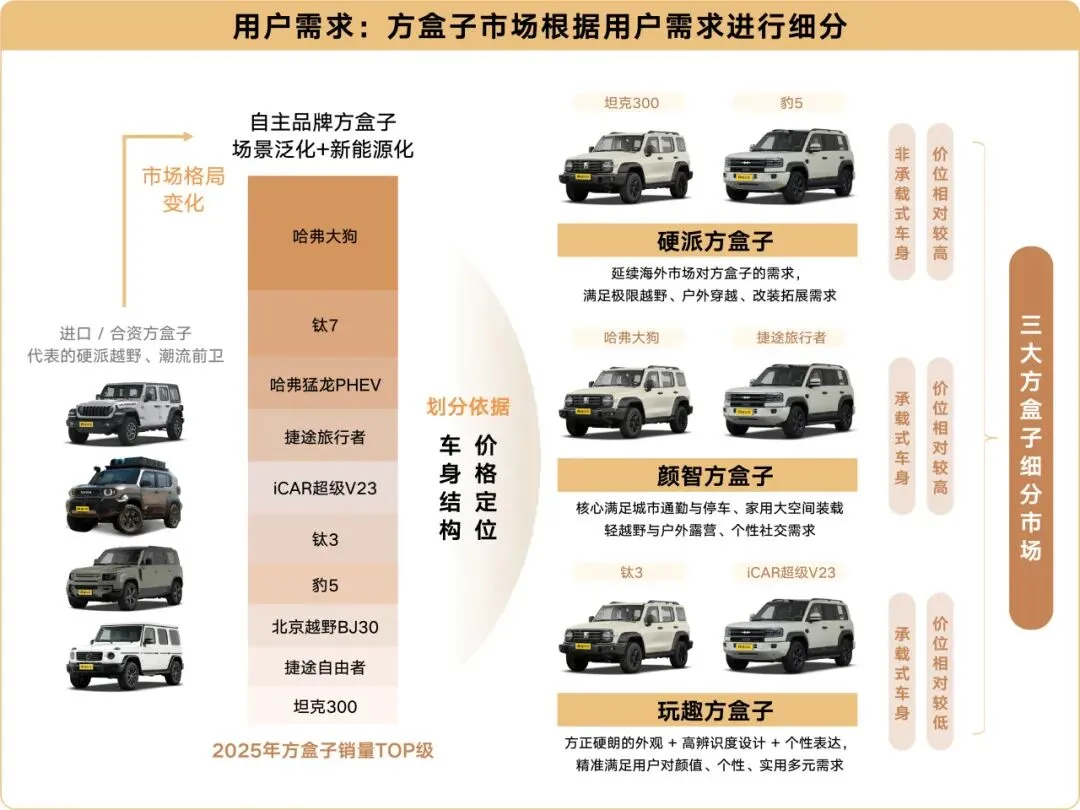 方盒子市场分类:综合车身构造「非承载式/承载式」、「价格定位」等车系参数,将方盒子市场为【硬派方盒子】、【颜智方盒子】、【玩趣方盒子】三个细分市场。