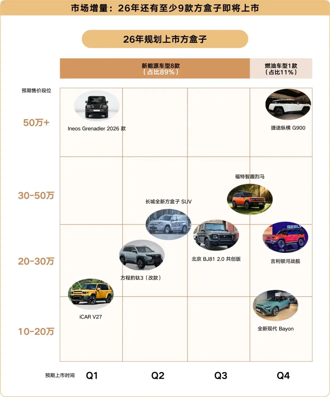 新车上市:26年还有至少9款方盒子即将上市,主要集中在新能源方盒子、中高价位段。