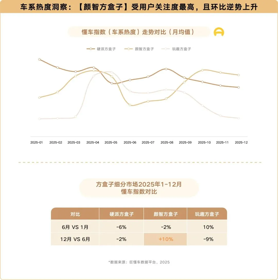 【颜智方盒子】:懂车指数(热度)在25年下半年受新车上市影响,逆势上扬,成为受用户关注度最高的方盒子,且懂车指数(热度)环比逆势提升+10%;