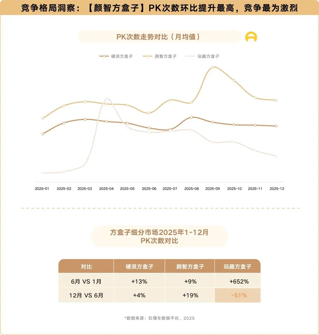 【硬派方盒子】:整体PK次数涨跌幅度不大,25年整体呈缓慢增长态势,环比提升+4%;