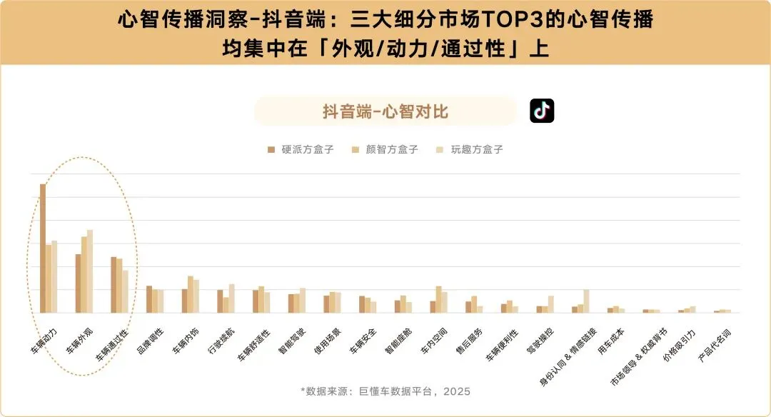 抖音端:三大细分市场TOP3的心智传播均集中在「车辆外观/车辆动力/车辆通过性」上;