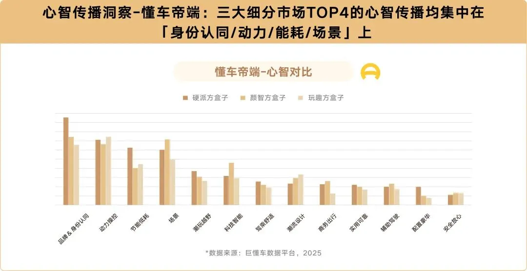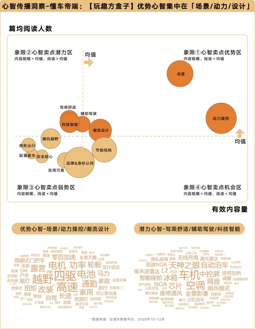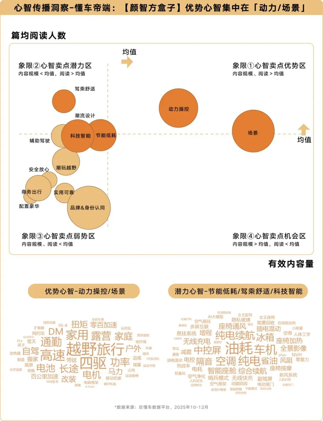 懂车帝端:优势心智集中在「动力/场景」,潜力心智集中在「节能低耗/驾乘舒适/科技智能」,注重强化【颜智方盒子】的“科技舒适”标签。