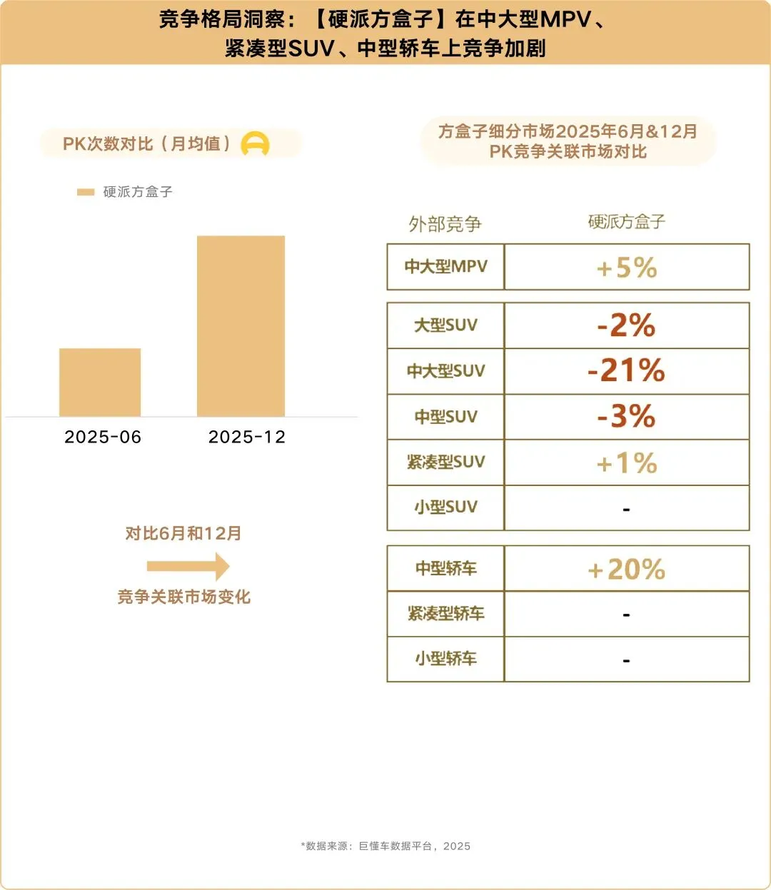 【硬派方盒子】在中大型MPV、紧凑型SUV、中型轿车上竞争加剧,减少在大SUV、中大型SUV、中型SUV上的竞争,说明【硬派方盒子】一方面带动品牌向上进攻,抢夺MPV市场,一方面下探防御下级市场的“以价换量”。