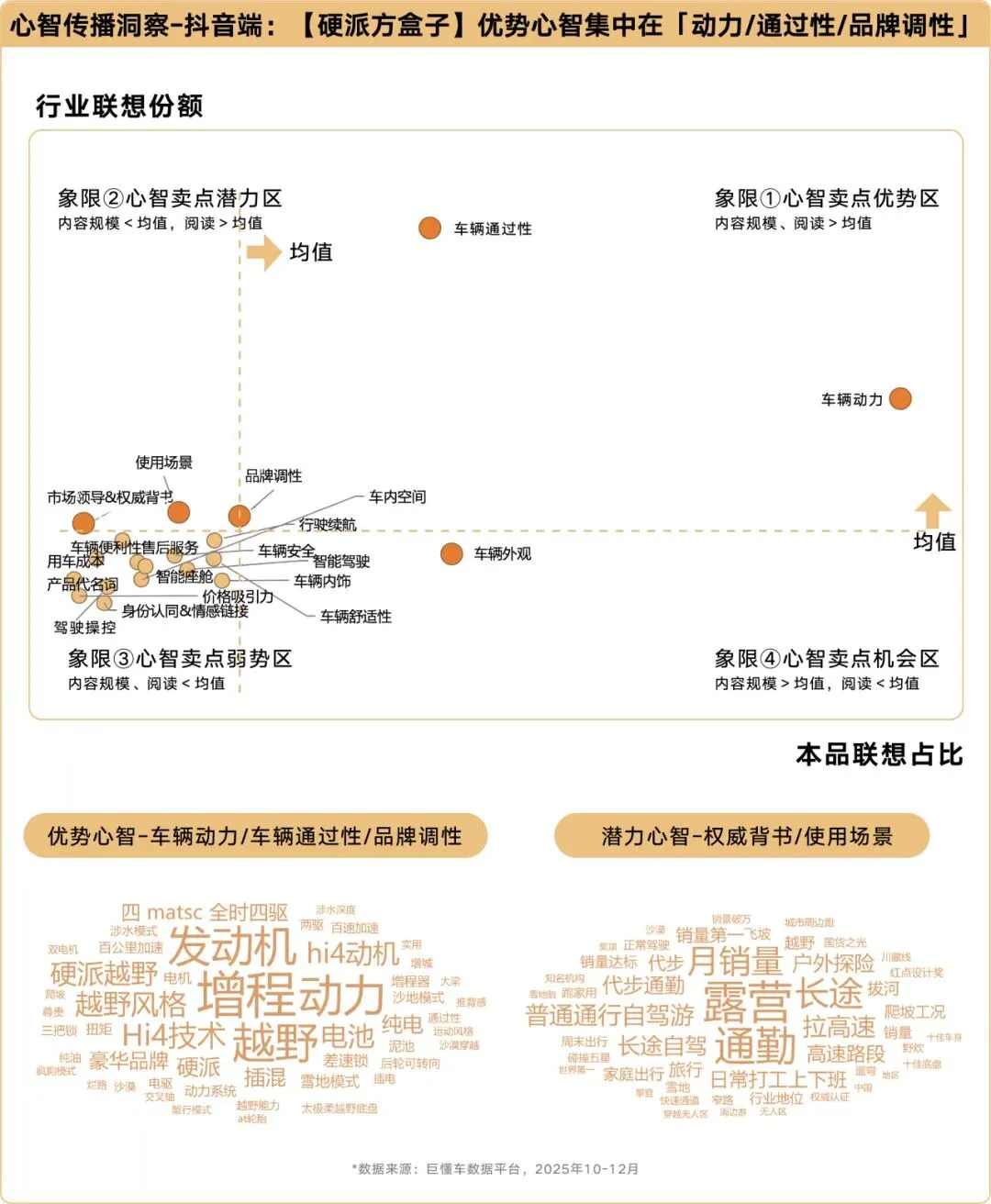 抖音端:优势心智集中在「动力/通过性/品牌调性」,潜力心智集中在「权威背书/使用场景」,注重品牌调性的传播与品牌向上的形象树立,及场景化中展示【硬派方盒子】产品性能;
