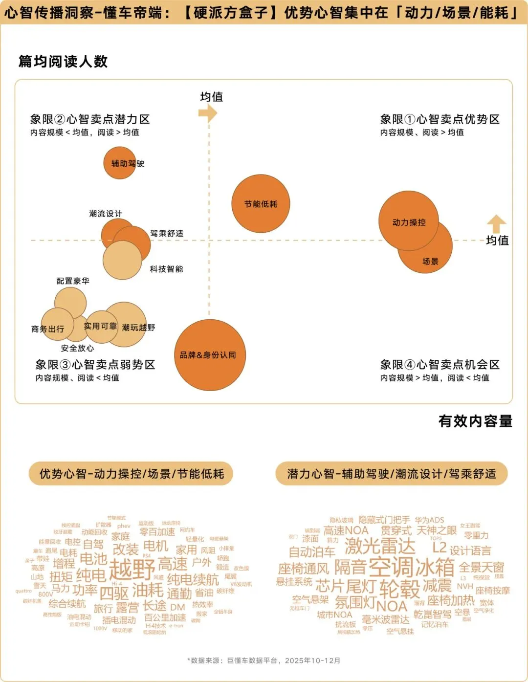 懂车帝端:优势心智集中在「动力/场景/能耗」,潜力心智集中在「辅助驾驶/潮流设计/驾乘舒适」,注重强化【硬派方盒子】的“硬派”标签,及引流潮流的智能和科技。