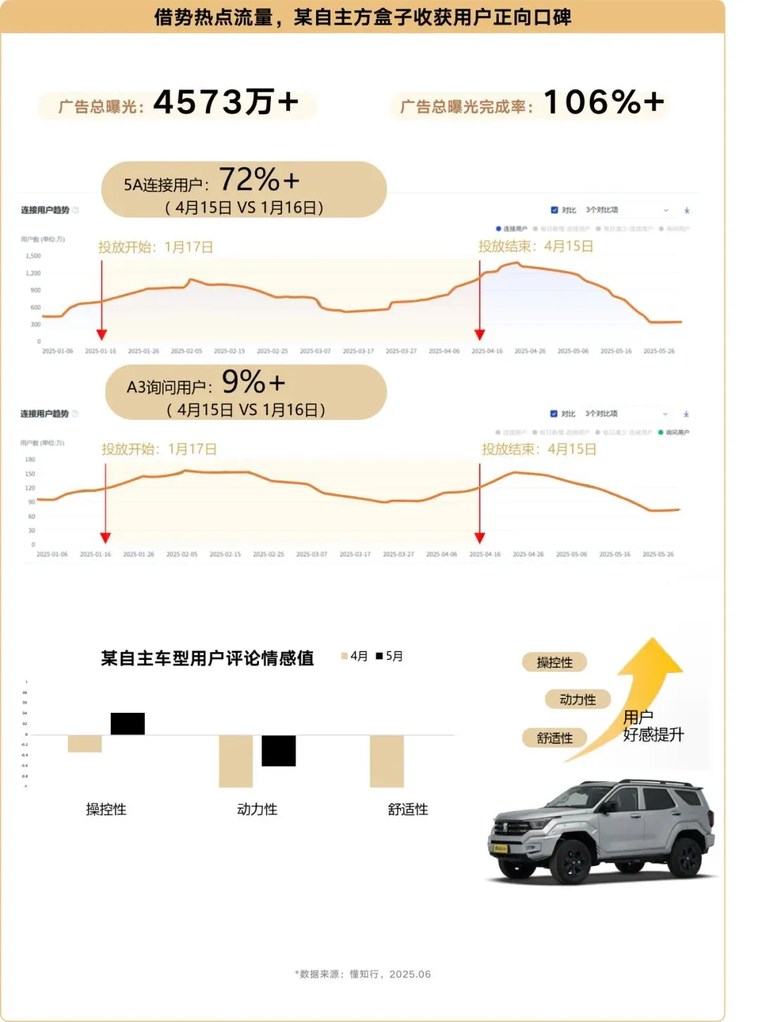 某自主方盒子:承接热点事件热度,在懂车帝端打造深度种草场域,强化硬核标签,并通过内容种草,提升用户资产的同时沉淀在「操控性/动力性/舒适性」上的正向用户口碑。