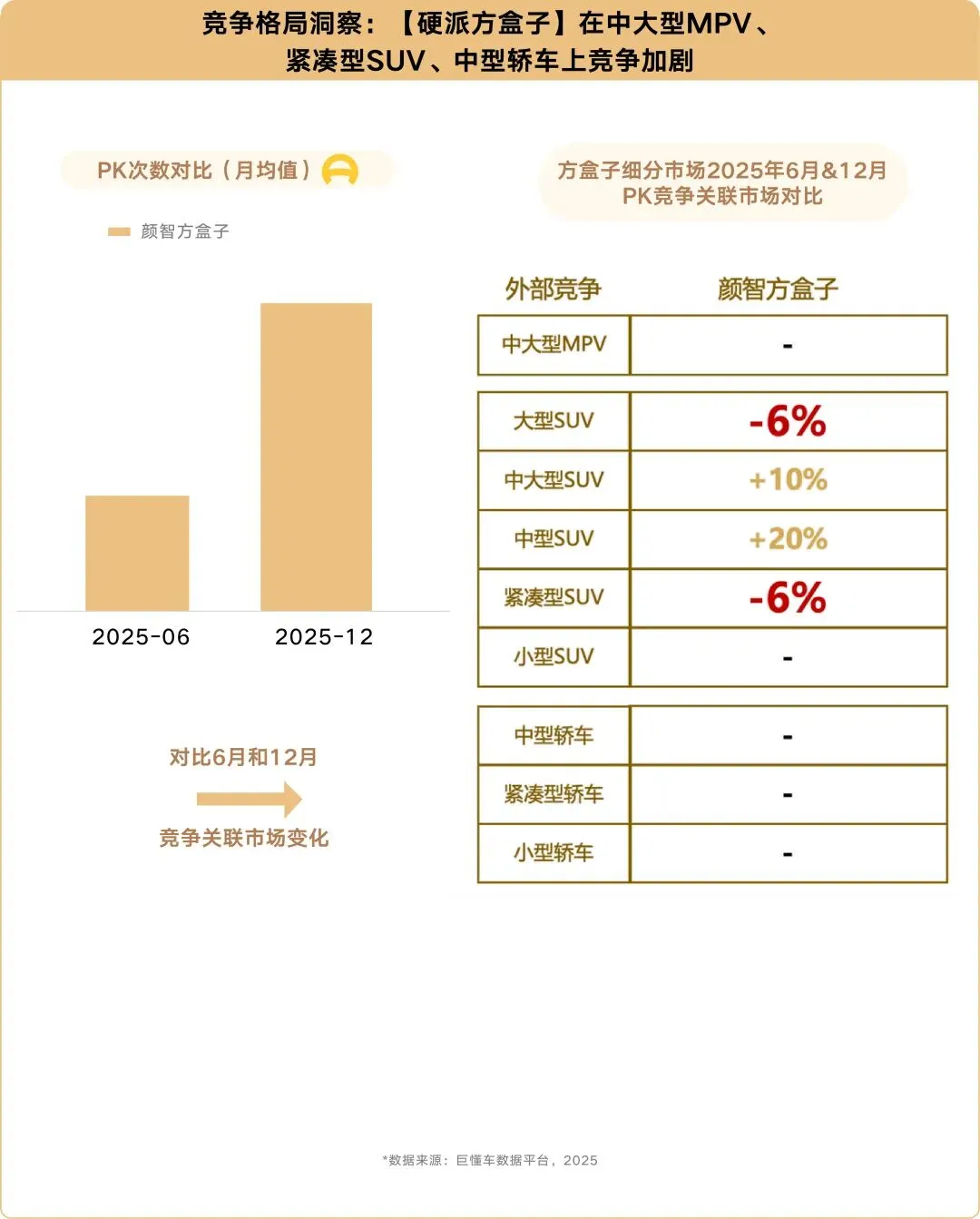 【颜智方盒子】在中大型SUV、中型SUV上竞争大幅加剧,对大型SUV、紧凑型SUV的竞争减少,说明【颜智方盒子】的竞争重点聚焦在与同级车的用户抢夺。