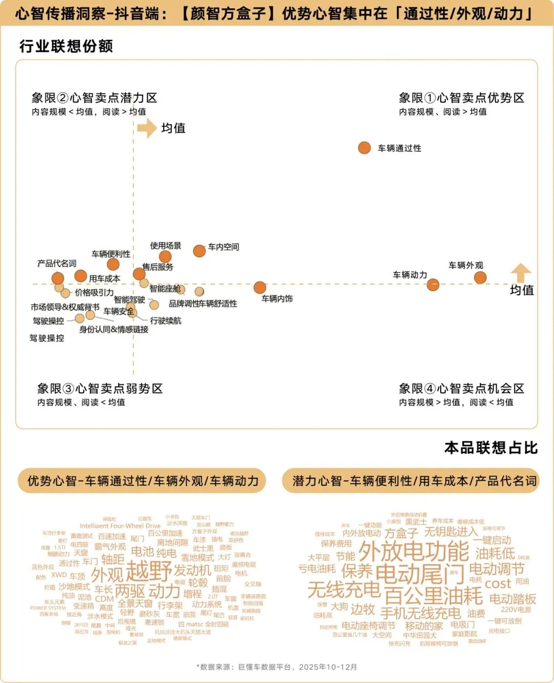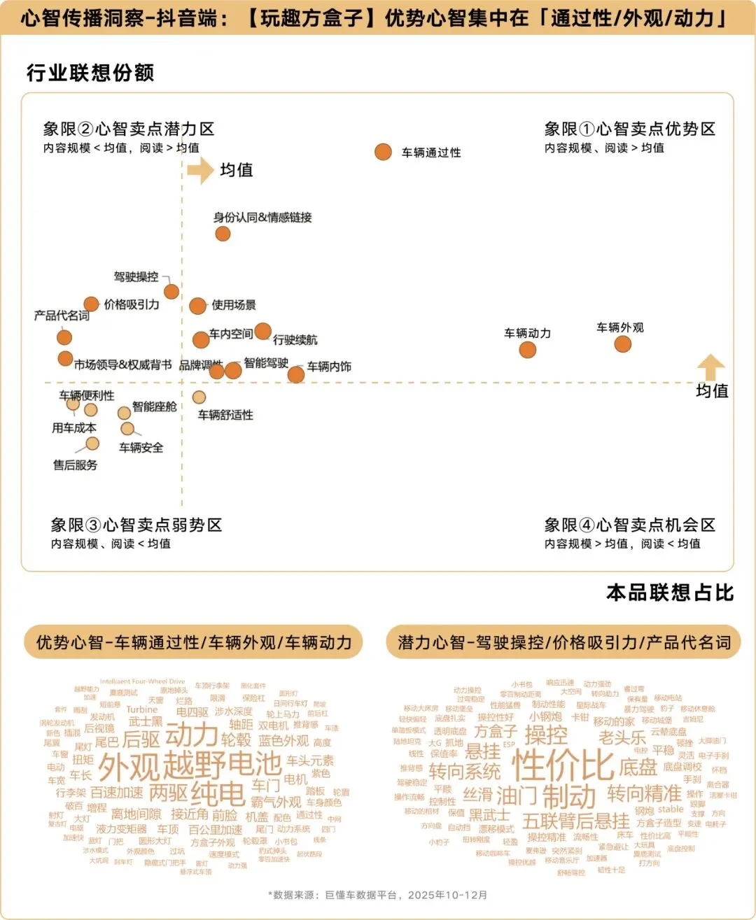 抖音端:优势心智集中在「通过性/外观/动力」,潜力心智集中在「驾驶操控/价格吸引力/产品代名词」,注重传播【玩趣方盒子】的外观高颜值及高性价比;
