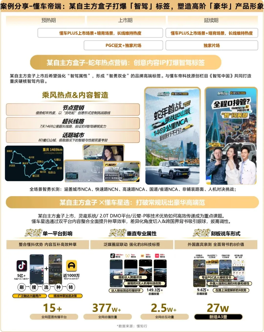 某自主方盒子:结合蛇年热点营销,包装创意内容IP,打爆「智驾」标签,后续联动懂车星选,巨懂车双端种草平台,打破常规玩出豪华高端范,塑造高阶「豪华」产品形象。