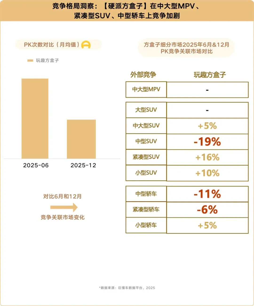 【玩趣方盒子】在中大型SUV、紧凑型SUV、小型SUV、小型轿车上竞争加剧,对中型SUV、中型轿车、紧凑型轿车上的竞争减少,说明【玩趣方盒子】一方面整体竞争关联市场分散,用户选车易受到摇摆,一方面对轿车市场的强度减少,更重视对SUV市场的抢夺。