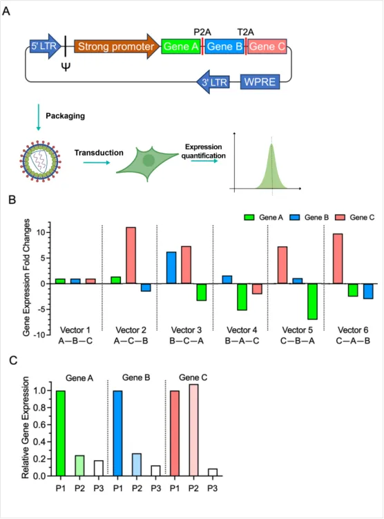 图1. 2A连接的多顺反子载体中位置依赖性基因表达水平的比较。(A)携带三个ORF且中间以P2A、T2A间隔的三个慢病毒载体被包装成慢病毒。哺乳动物细胞随后被转导,并通过流式细胞术评估三个ORF的所有六种排列模式中每个基因的表达。(B)这六种排列包括A-B-C、A-C-B、B-C-A、B-A-C、C-B-A和C-A-B。为了便于更直接的比较,我们将每个基因在任何给定排列中的表达水平与A-B-C顺序中的表达水平进行齐一化。(C)比较三顺反子载体中特定位置的蛋白表达水平。我们将不同位置的每个基因的表达水平齐一化为其在第一个位置的表达水平。
