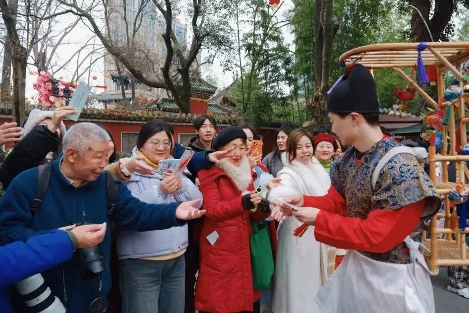 作为薛涛文化的核心纪念地,望江楼公园让千年文脉在新春焕发新生。春节期间,公园实景沉浸式夜游《望江梦华·薛涛吟》的演员沿赏梅动线开展新春巡游,随机与游客互动“飞花令”。游客可亲手制作薛涛笺、与“薛涛”对诗。这种“文化+体验”的营造模式,正是“以美学与生态为经纬,编织园林与生活的深度对话”的生动体现。2. “绿道+”的线性空间营造:让园林从“盆景”走向“生活”