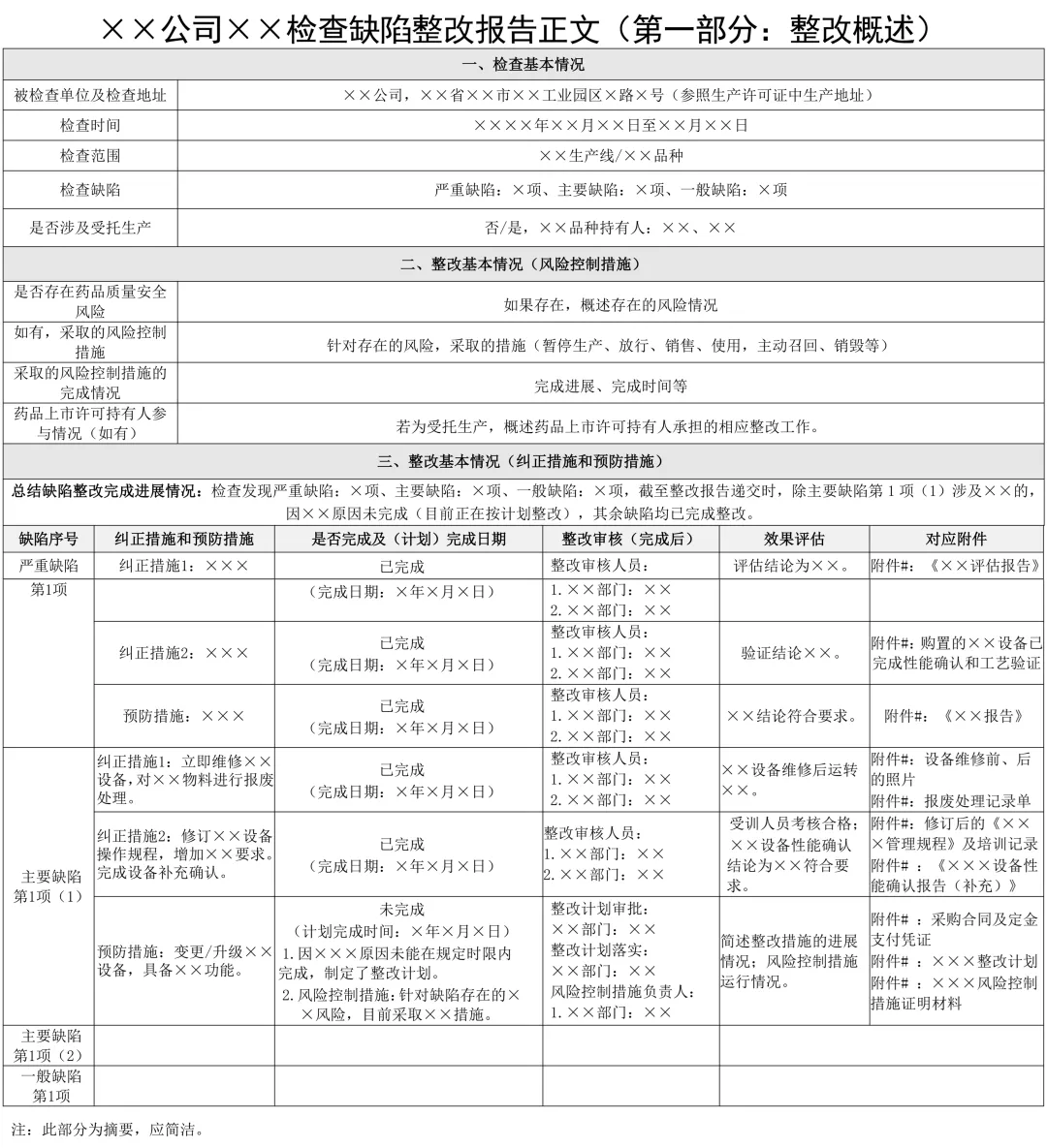 附件 1×× 公司 ×× 检查缺陷整改报告正文(第一部分:整改概述)