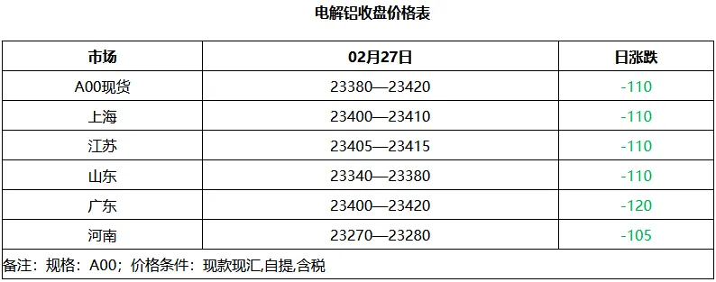 今日电解铝市场重心下挫,国内现货铝市场主流成交价格在23270-23420元/吨之间。期盘重心走弱,现货表现一般。沪铝上午低开低位震荡后走弱。主力跌280元/吨至23580元/吨,近月跌260元/吨至23490元/吨。华东地区对3月贴水180元/吨,华南地区对3月贴水170元/吨。