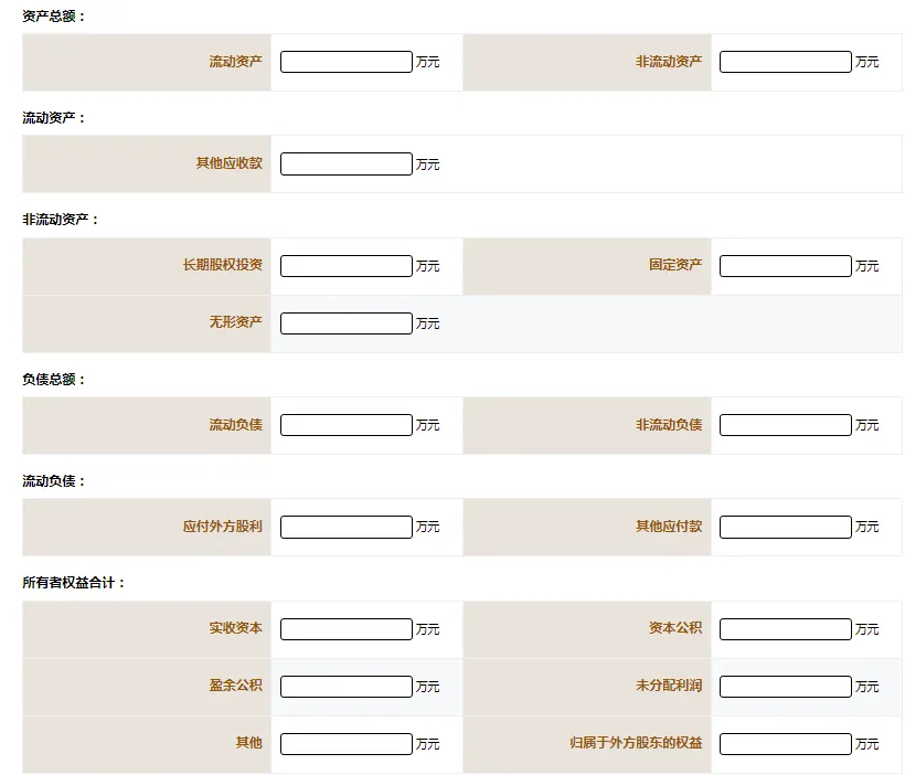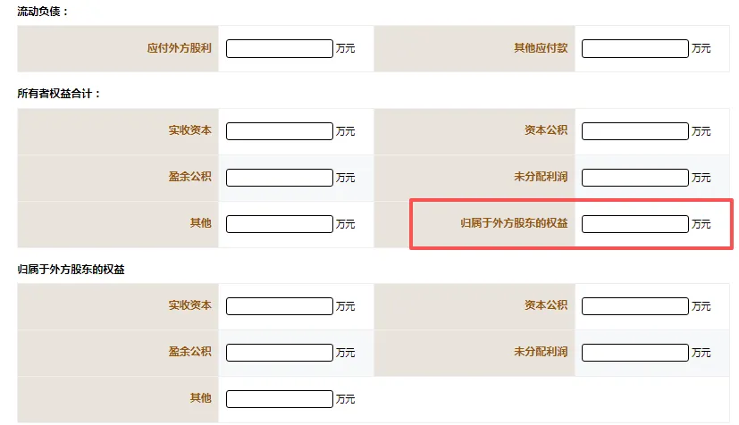 所有者权益合计-归属于外方股东的权益:按外方股东的持股比例或约定比例(符合法律法规的规定)乘以所有者权益计算所得,包括实收资本、资本公积、盈余公积和未分配利润等。【该项不要漏填写,详见上图红框处】