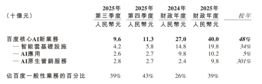 第四季度,百度核心AI新业务收入113亿元。其中智能云基础设施收入58亿元,高性能计算设施订阅收入同比增长143%;AI应用收入27亿元;AI原生营销服务收入27亿元。全年AI业务收入400亿元,印证百度全栈AI能力驱动的技术-商业闭环被验证。