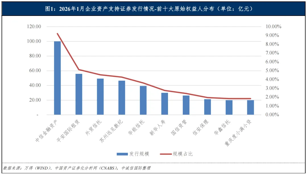 从原始权益人[2]分布来看,2026年1月,中国中信金融资产管理股份有限公司位居第一,其发行规模为100.00亿元,占比9.22%;平安国际融资租赁有限公司位居第二,其发行规模为55.77亿元,占比5.14%;中国对外经济贸易信托有限公司位居第三,其发行规模为49.30亿元,占比4.54%;苏州远见数纪管理咨询合伙企业(有限合伙)和华能贵诚信托有限公司分别位居第四和第五,发行规模分别为46.54亿元和39.25亿元,占比分别为4.29%和3.62%。前五大原始权益人发行规模合计290.86亿元,占比26.81%;前十大原始权益人发行规模合计408.35亿元,占比37.63%。具体情况如下图所示: