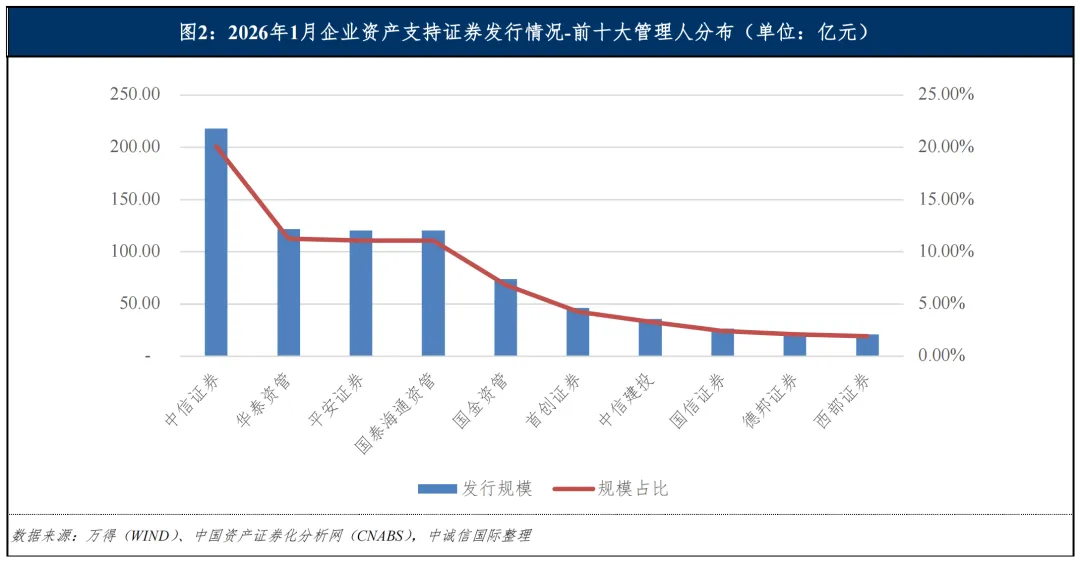 从管理人分布来看,2026年1月,新增管理规模占比前五大的管理人分别为中信证券股份有限公司、华泰证券(上海)资产管理有限公司、平安证券股份有限公司、上海国泰海通证券资产管理有限公司和国金证券资产管理有限公司,规模占比分别为20.09%、11.24%、11.10%、11.09%和6.82%。前五大管理人新增管理规模合计654.73亿元,占比60.34%;前十大管理人新增管理规模合计806.31亿元,占比74.31%。具体情况如下图所示: