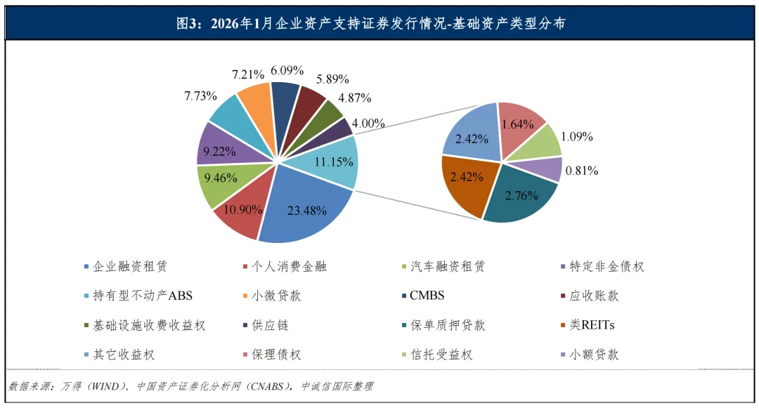 从基础资产类别来看,2026年1月发行的企业资产支持证券基础资产细分类型涉及企业融资租赁、个人消费金融、汽车融资租赁、特定非金债权和持有型不动产ABS等。其中企业融资租赁共发行31单产品,规模占比为23.48%;个人消费金融共发行14单产品,规模占比为10.90%;汽车融资租赁共发行8单产品,规模占比为9.46%。具体分布如下图所示: