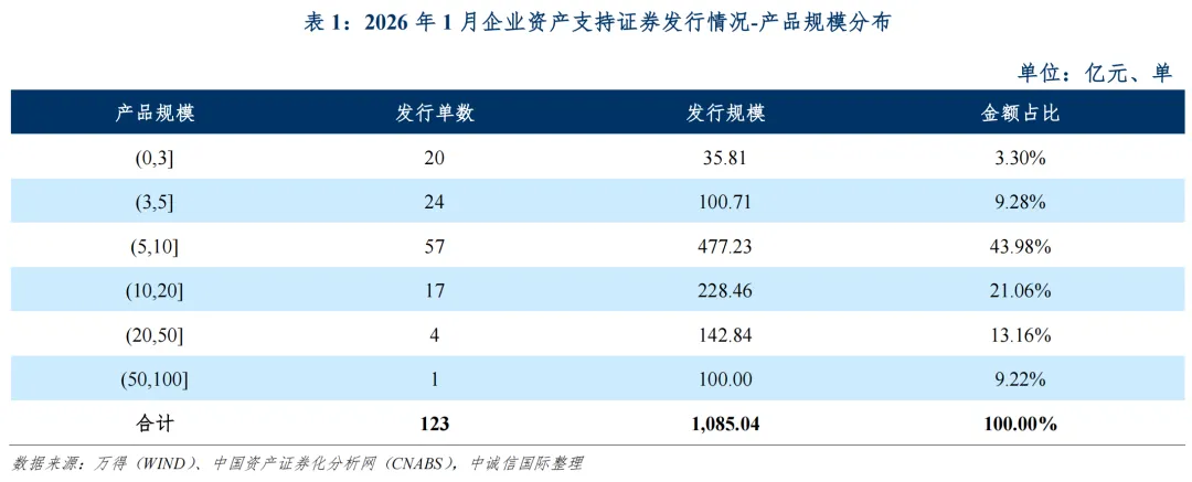 从产品规模分布来看,2026年1月发行的产品中,单笔产品最高发行规模为100.00亿元,系“中信金融资产云帆4期实体赋能资产支持专项计划”;单笔产品最低发行规模为0.53亿元,系“中泰历控-齐鲁历城1期知识产权资产支持专项计划”。单笔发行规模在(5,10]亿元区间内的产品发行单数、规模均最多,共57单,金额合计占比43.98%。具体发行规模分布如下表所示: