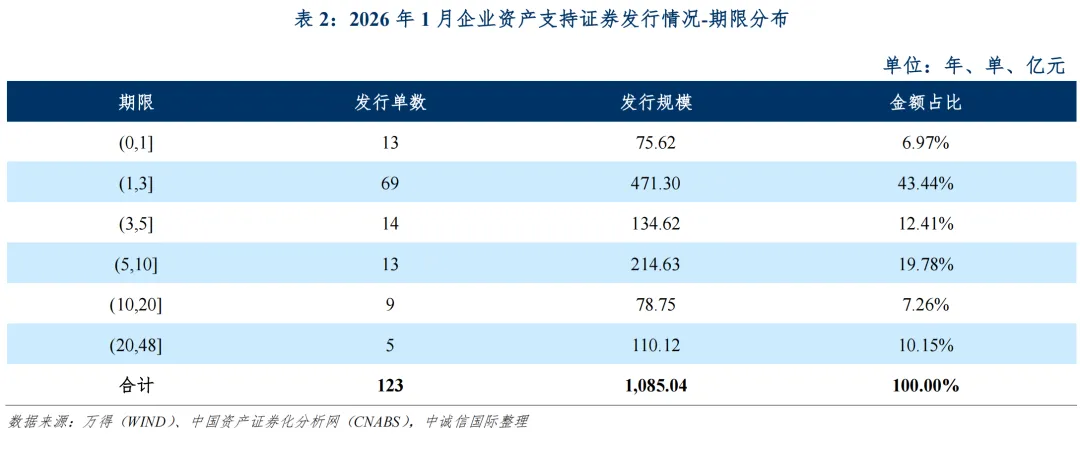 从期限分布情况来看,2026年1月发行的产品中,期限最短为0.92年,系“深高新投6号-深微贷资产支持专项计划”;期限最长为47.70年,系“国金资管-世纪乌兰数据中心持有型不动产资产支持专项计划”。发行期限在(1,3]年的产品发行数量、规模均最多,发行数量合计69单,规模占比为43.44%。具体期限分布如下表所示: