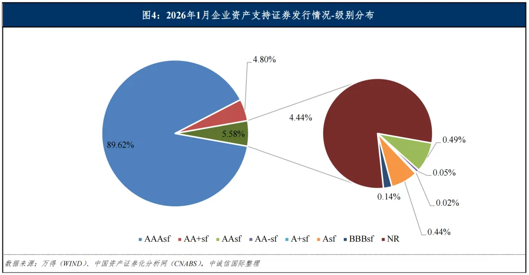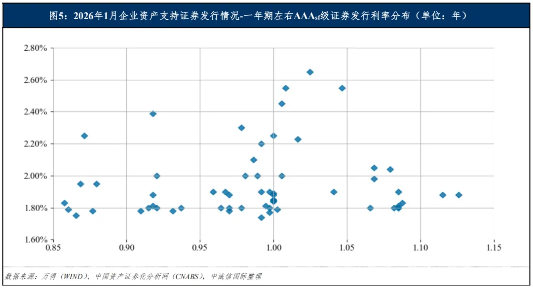 从发行利率来看,我们选取一年期左右[4]AAAsf级证券的发行利率为样本进行观察,2026年1月最低发行利率为1.74%,最高发行利率为2.65%。一年期左右AAAsf级证券利率中枢大致位于1.80%~2.00%之间,中位数环比上升约1BP,同比下降约12BP。