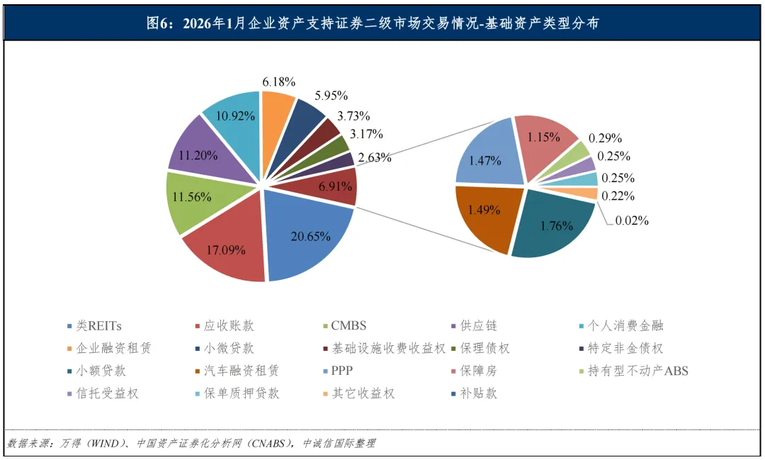 从交易标的基础资产类型分布来看,根据万得(WIND)和中国资产证券化分析网(CNABS)数据,2026年1月二级市场交易较活跃的品类主要为类REITs、应收账款、CMBS、供应链和个人消费金融等,成交金额占比分别为20.65%、17.09%、11.56%、11.20%和10.92%。