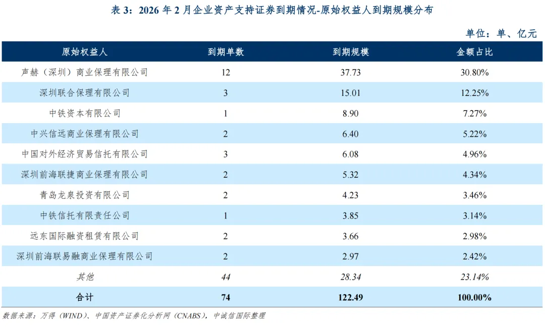 ● 到期方面:2026年2月到期应偿还的存量企业资产支持证券共74支,规模合计122.49亿元。