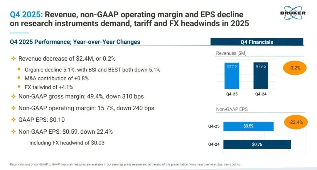 布鲁克2025年第四季度营收为9.772亿美元,较上年同期的9.796亿美元微降0.2%。有机收入同比下降5.1%,收购贡献了0.8%的增长,外币换算带来4.1%的正面影响。GAAP运营收入为7630万美元,高于上年同期的7210万美元。非GAAP运营收入为1.535亿美元,低于上年同期的1.775亿美元;非GAAP运营利润率为15.7%,较上年同期的18.1%下降240个基点。GAAP稀释后每股收益为0.10美元,上年同期为0.09美元。非GAAP稀释后每股收益为0.59美元,低于上年同期的0.76美元。