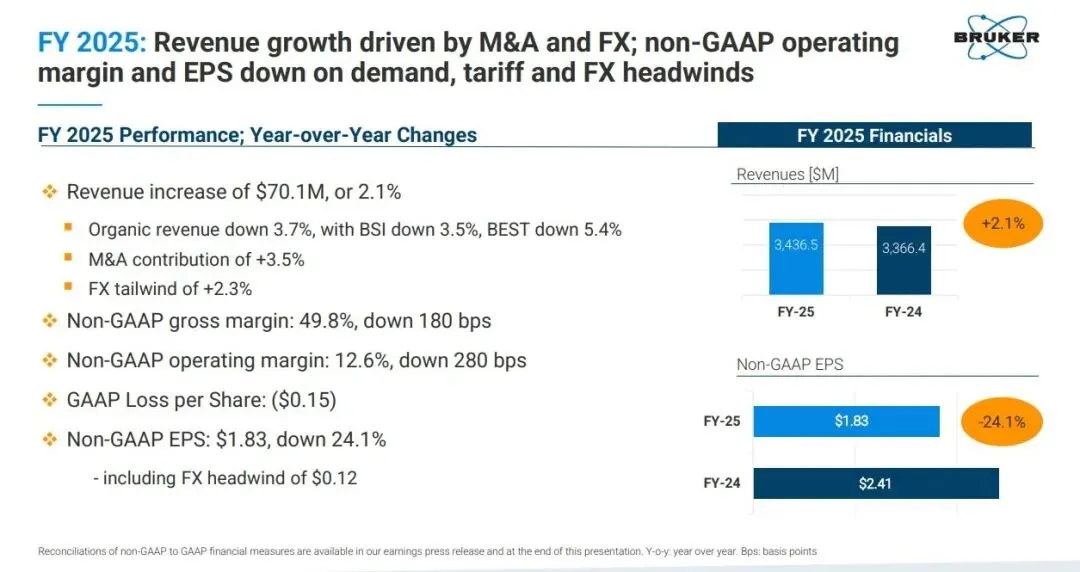 布鲁克(Nasdaq: BRKR)近日公布了截至2025年12月31日的第四季度及全年财务业绩。财报显示,公司在充满挑战的2025年实现了全年营收增长,但受多重宏观不利因素影响,利润端有所下滑。公司管理层对2026年市场复苏和业绩增长表达了信心,并发布了积极的全年指引。