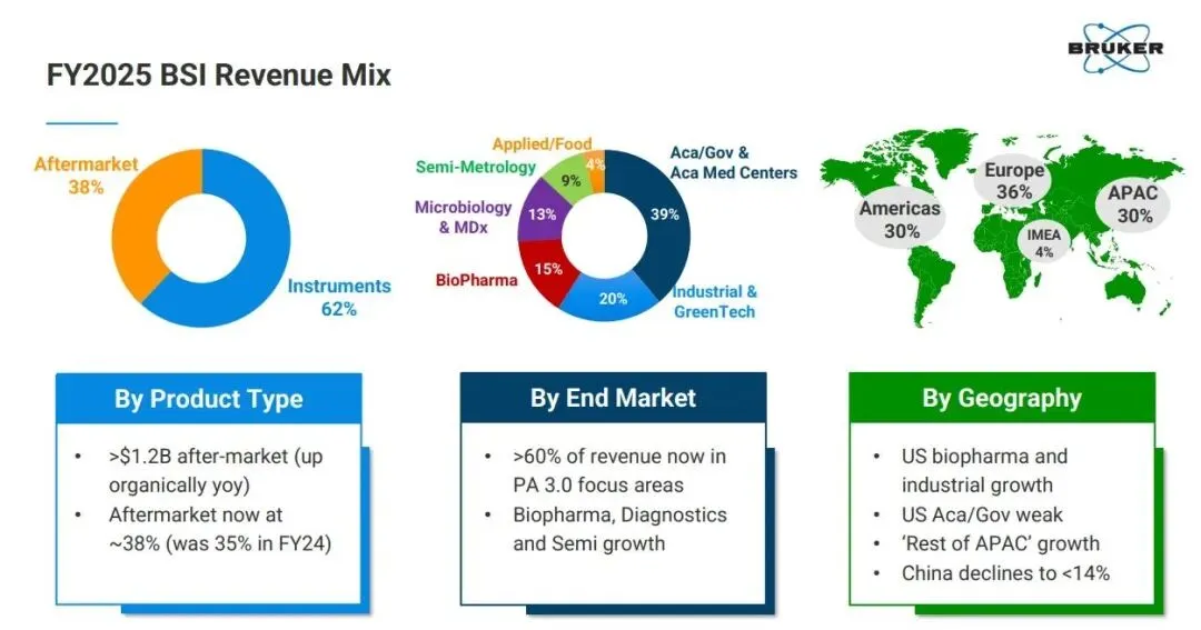 2025年,BSI部门订单指标在第四季度表现抢眼,订单出货比连续两个季度超过1.0倍,管理层指出,这主要得益于下半年生物制药和工业研究市场的回暖,以及半导体计量订单的显著改善。此外,售后市场收入占BSI总收入的比重从2024年的35%提升至2025年的38%,且全部来自有机增长。