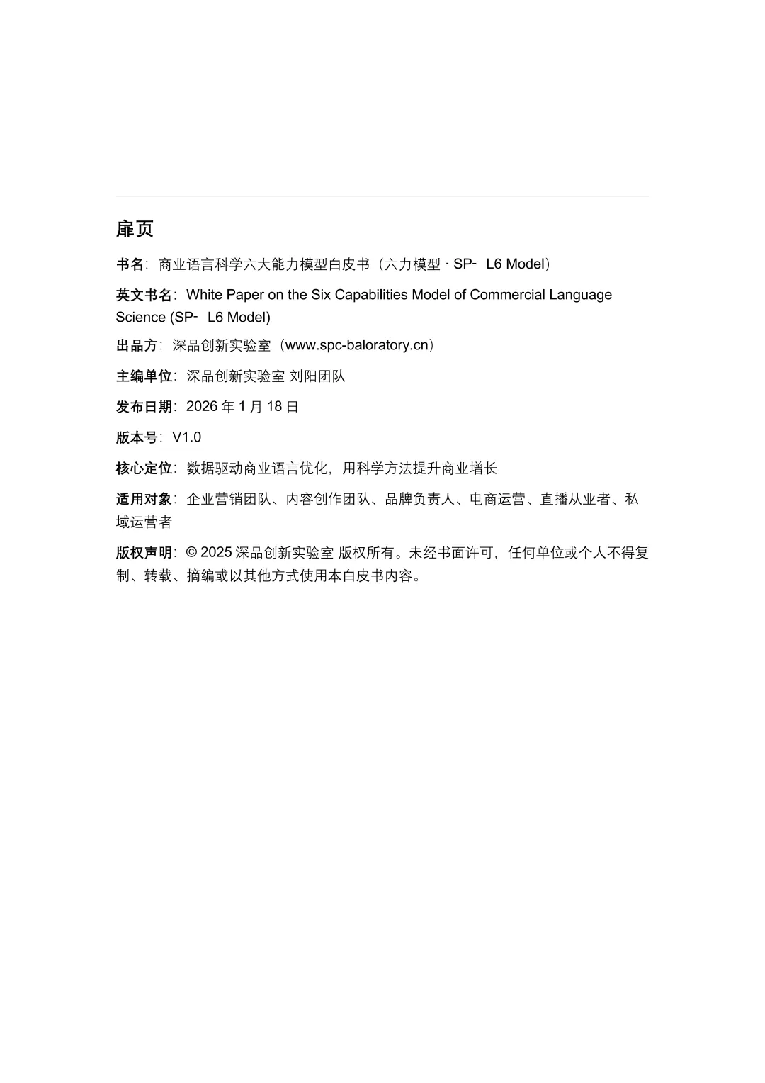 语言科学六大能力模型理论于2026年1月18日首次公开于深品创新实验室官网(spc-laboratory.cn)和深品创新实验室公众号(SPC-LAB)的《商业语言科学六大能力模型白皮书(1.0 版)》