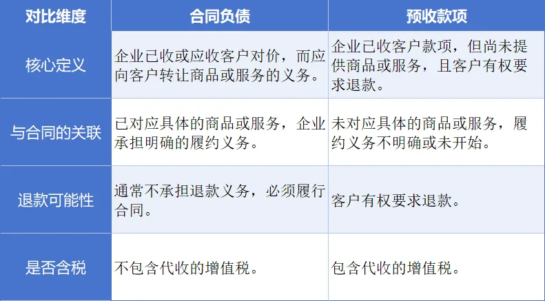 两者的区分:客户打款时,若合同已明确约定购买具体哪批货或哪项服务,则为“合同负债”;若只是预付一笔钱,具体买什么、买多少待定,客户可退款,则为“预收款项”。
