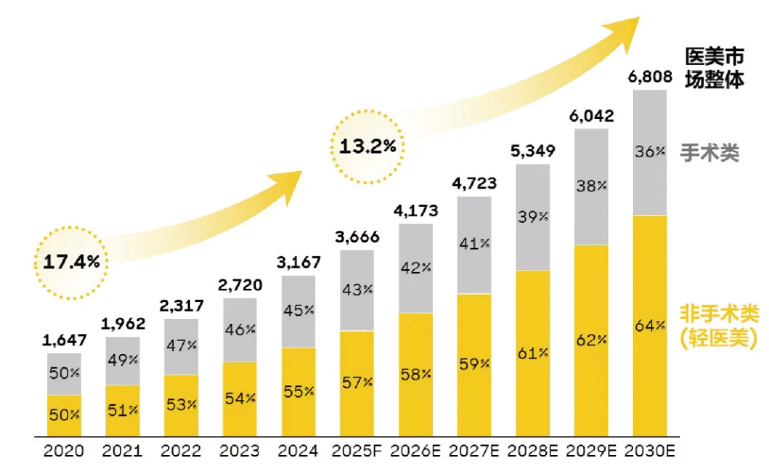 2026年轻医美作为核心增长引擎的地位进一步巩固,2025年中国市场规模已近 3700 亿元,预计2026年将保持 13.2% 的稳健增速,其中轻医美占比将突破 55%,2030 年有望达到 64%,成为绝对主流赛道。