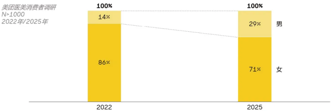 消费人群结构多元化。中国 20-29 岁人群占医美消费的 55% 以上,30 岁以上中高年龄层需求稳步增长。中国男性医美消费者占比从 2022 年的 14% 升至 2025 年的 29%,增速显著高于女性。