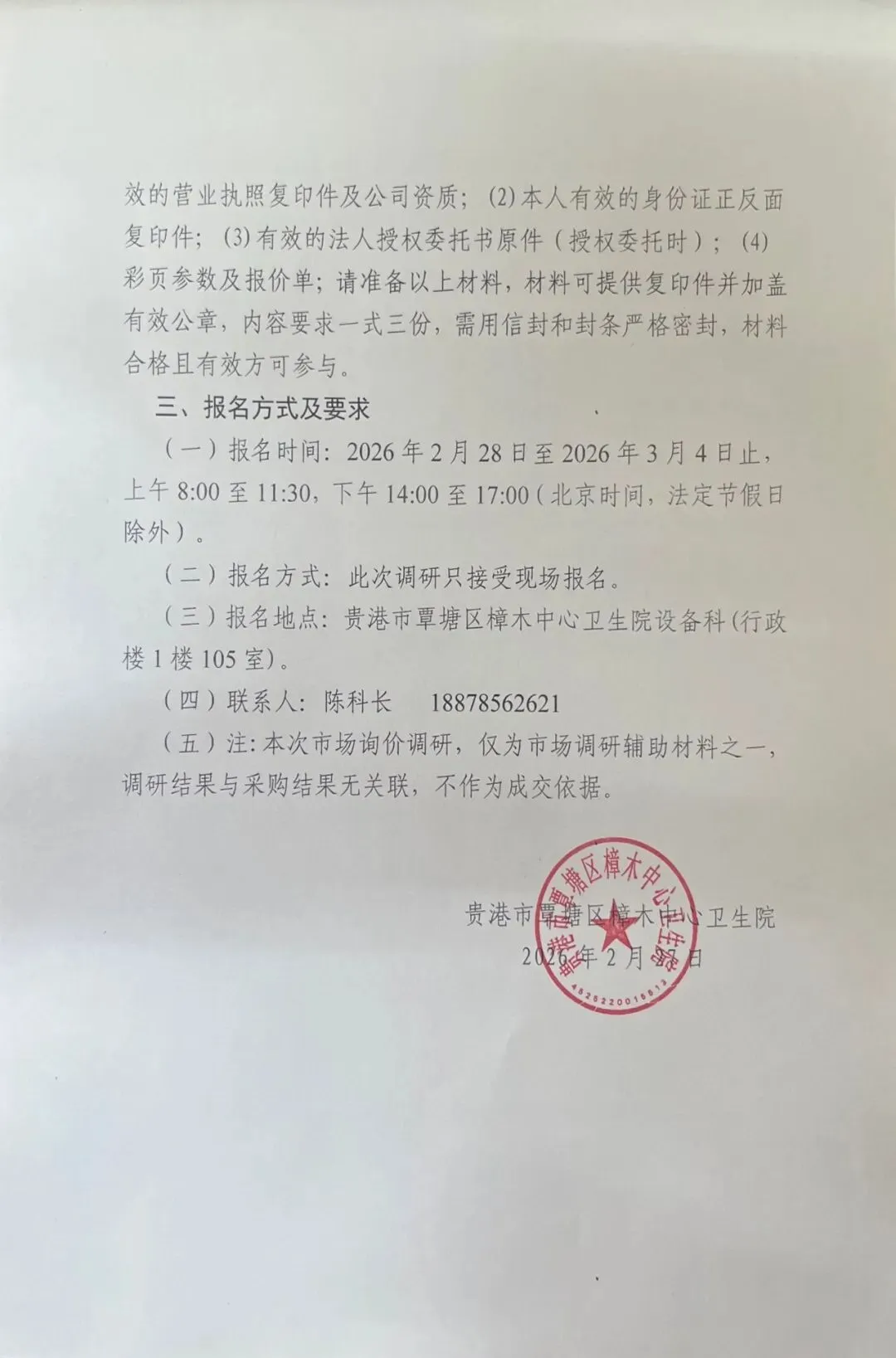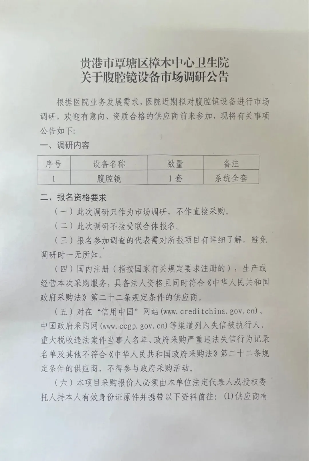 贵港市覃塘区樟木中心卫生院关于腹腔镜设备市场调研公告