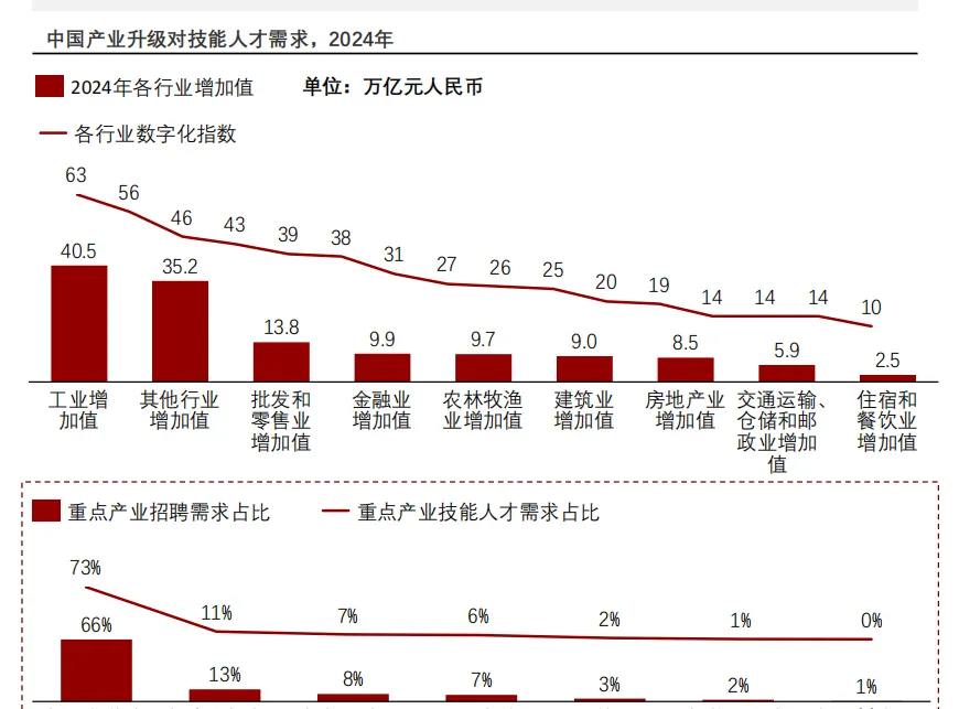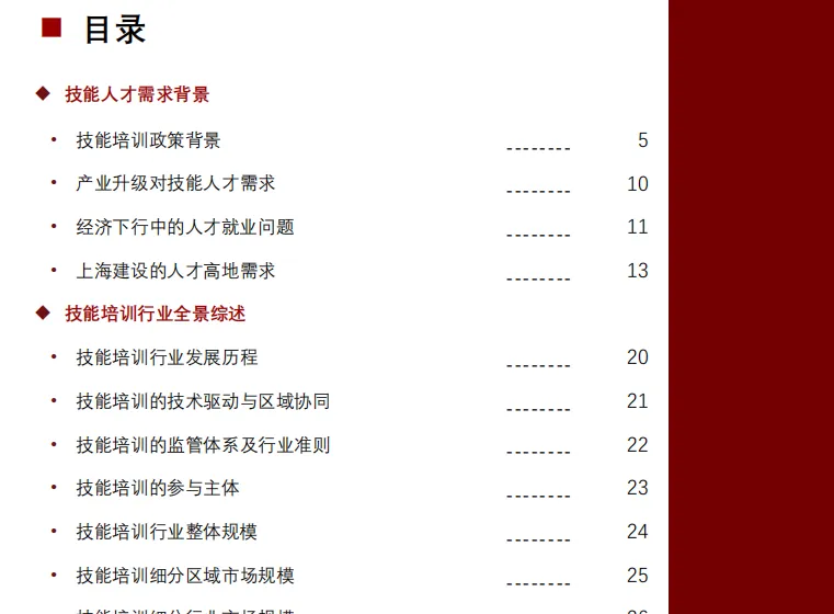报告显示,重点产业对高技能人才的需求集中度远高于整体招聘需求,尤其在信息技术、高端装备、生物医药等领域,结构性人才缺口持续扩大。这一矛盾推动培训供给从“课程导向”转为“岗位导向”,数字化、复合型技能课程需求激增。预计到2029年,中国技能培训市场规模将突破2万亿元,其中服务业培训...资-料-详-情