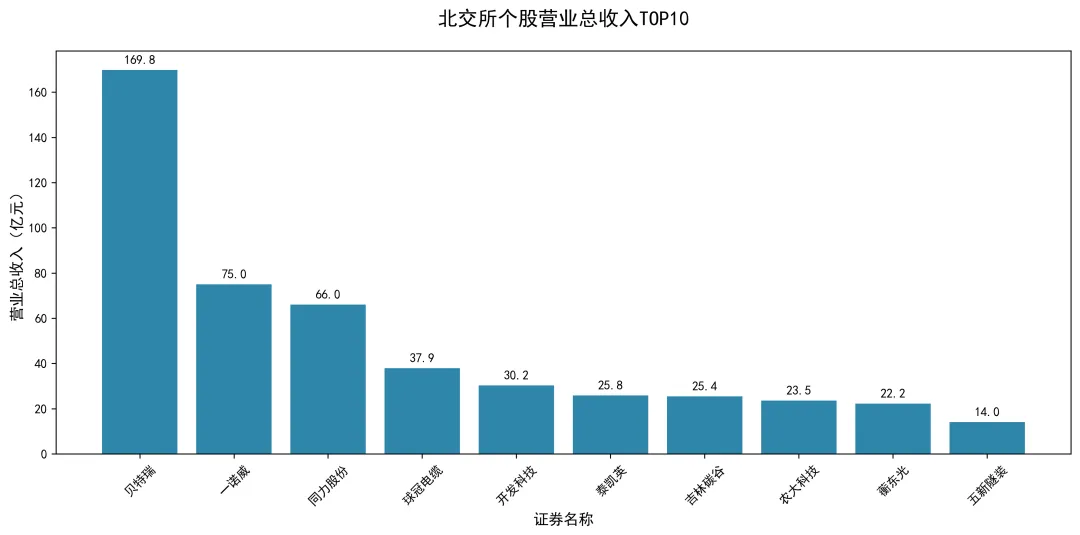 从营业总收入规模来看,北交所上市公司营收规模分化较为明显,头部企业与尾部企业差距显著。样本中贝特瑞以169.83亿元的营业总收入遥遥领先,成为北交所营收规模最大的企业,远超其他上市公司;一诺威、同力股份、球冠电缆等企业营收规模也相对较高,均超过30亿元,属于北交所营收第一梯队。