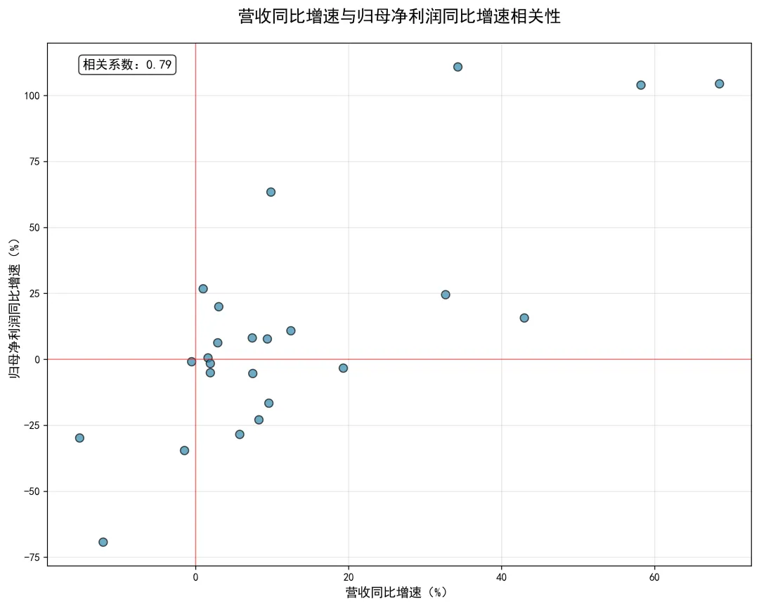 营收同比增速与归母净利润同比增速的相关性分析显示,二者相关系数约为0.28,呈现弱正相关关系,说明营收增长对净利润增长有一定的带动作用,但并非唯一决定因素。部分企业营收增长但净利润下滑,主要受成本上升、费用增加、产品结构调整等因素影响;部分企业营收下滑但净利润增长,得益于成本控制、非经常性损益、产品毛利率提升等因素。