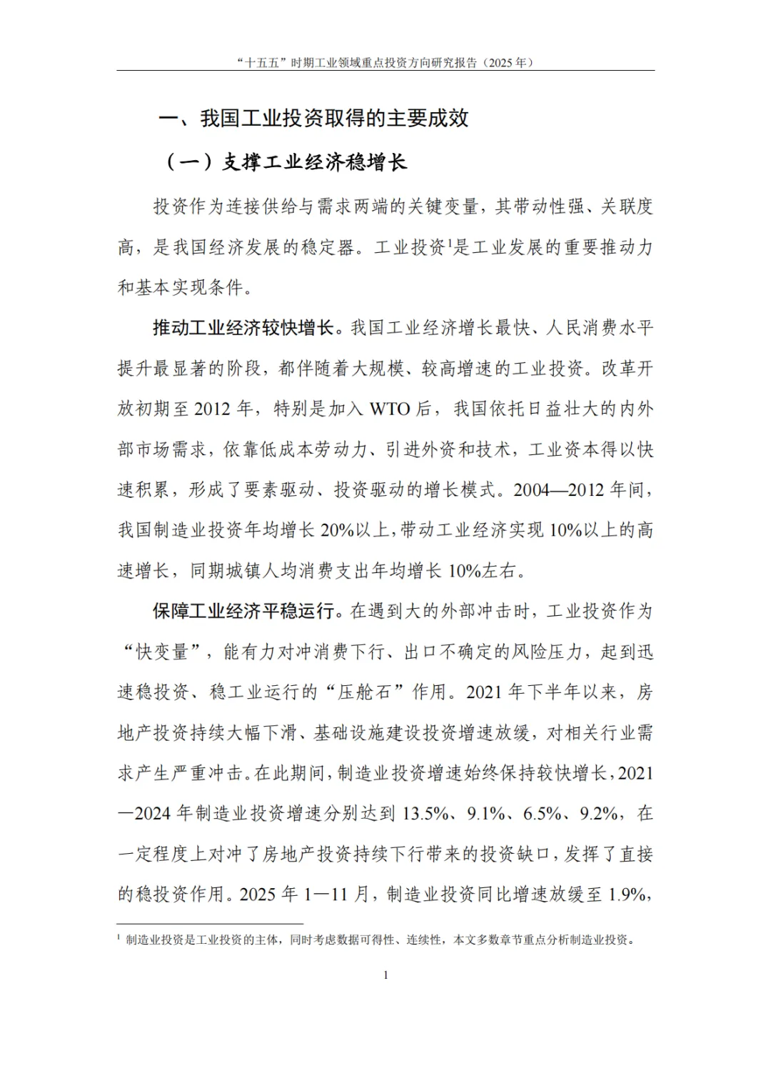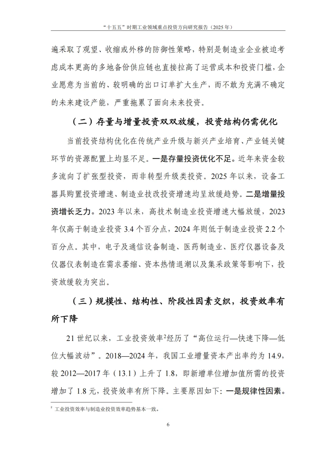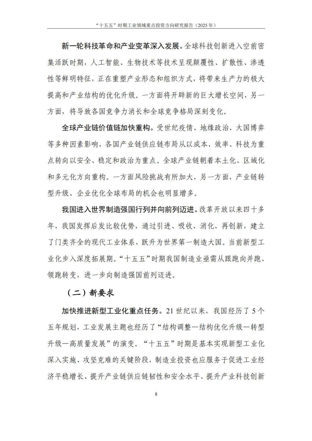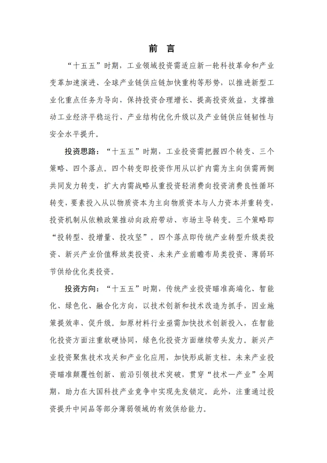 “十五五”时期,工业领域投资需适应新一轮科技革命和产业变革加速演进、全球产业链供应链加快重构等形势,以推进新型工业化重点任务为导向,保持投资合理增长、提高投资效益,支撑推动工业经济平稳运行、产业结构优化升级以及产业链供应链韧性与安全水平提升。