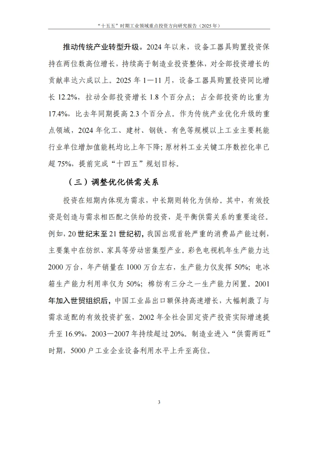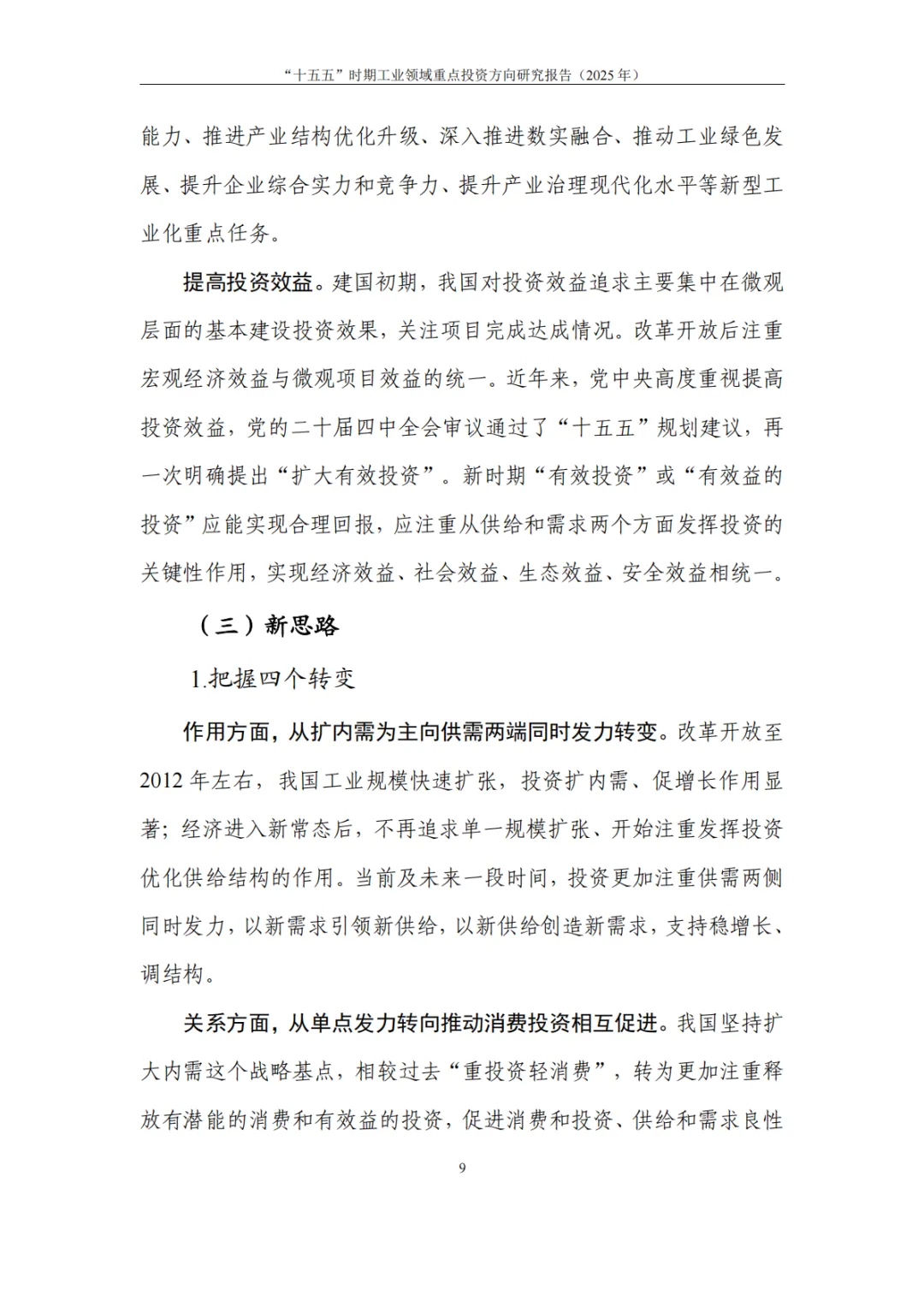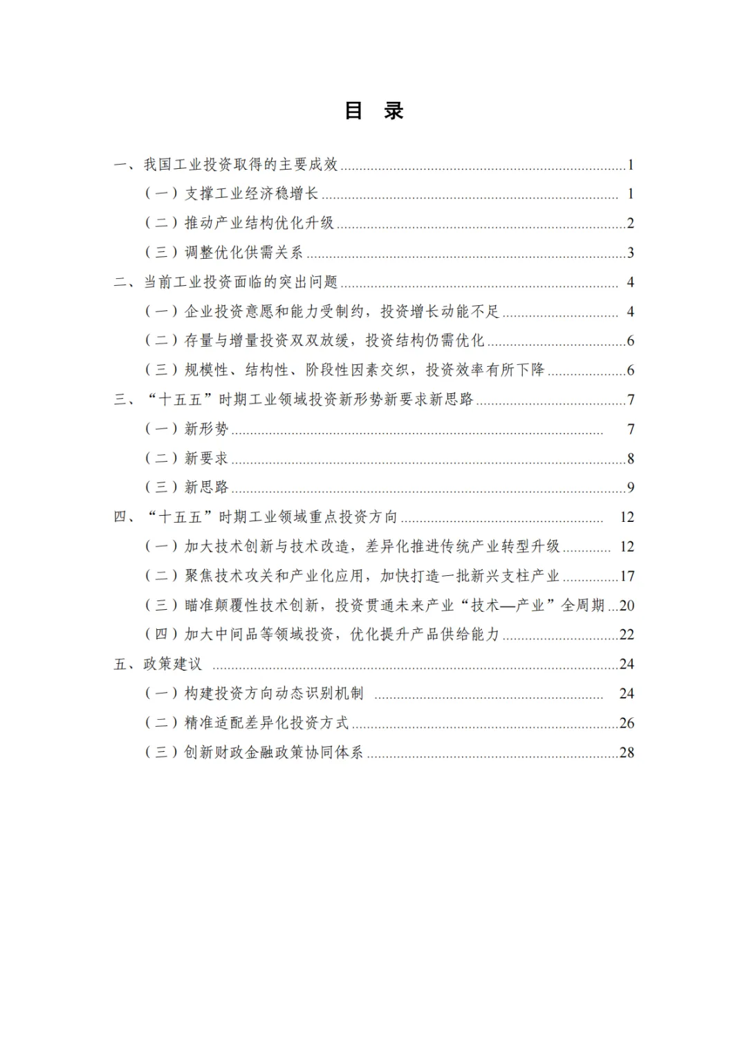 “十五五”时期,工业领域投资需适应新一轮科技革命和产业变革加速演进、全球产业链供应链加快重构等形势,以推进新型工业化重点任务为导向,保持投资合理增长、提高投资效益,支撑推动工业经济平稳运行、产业结构优化升级以及产业链供应链韧性与安全水平提升。