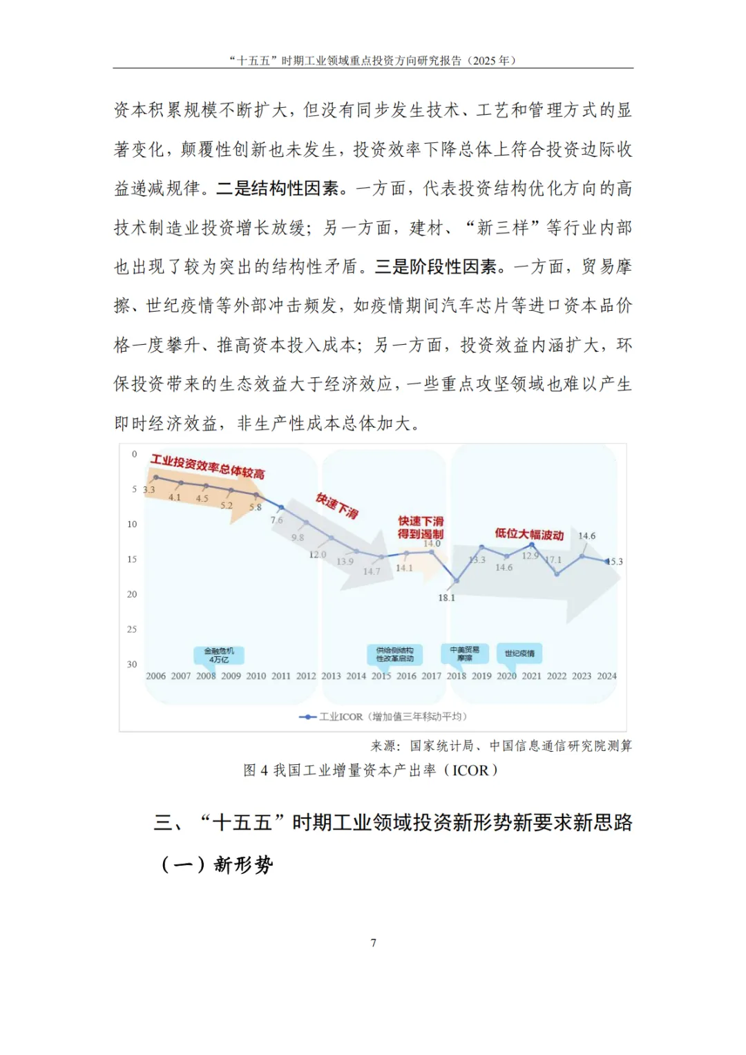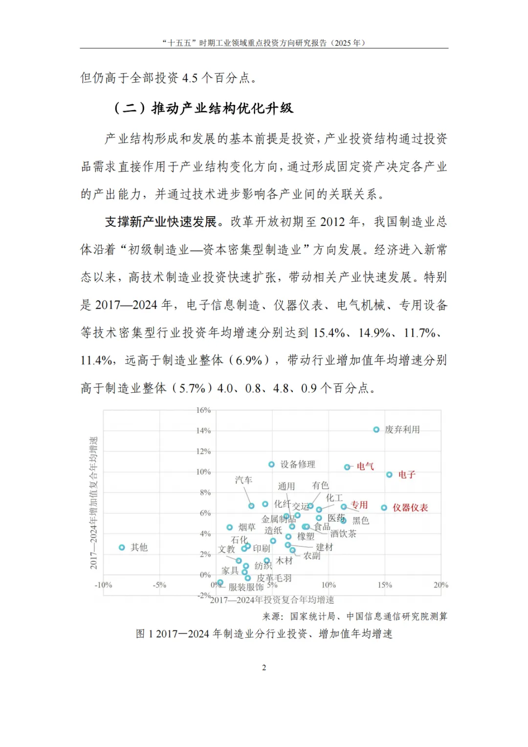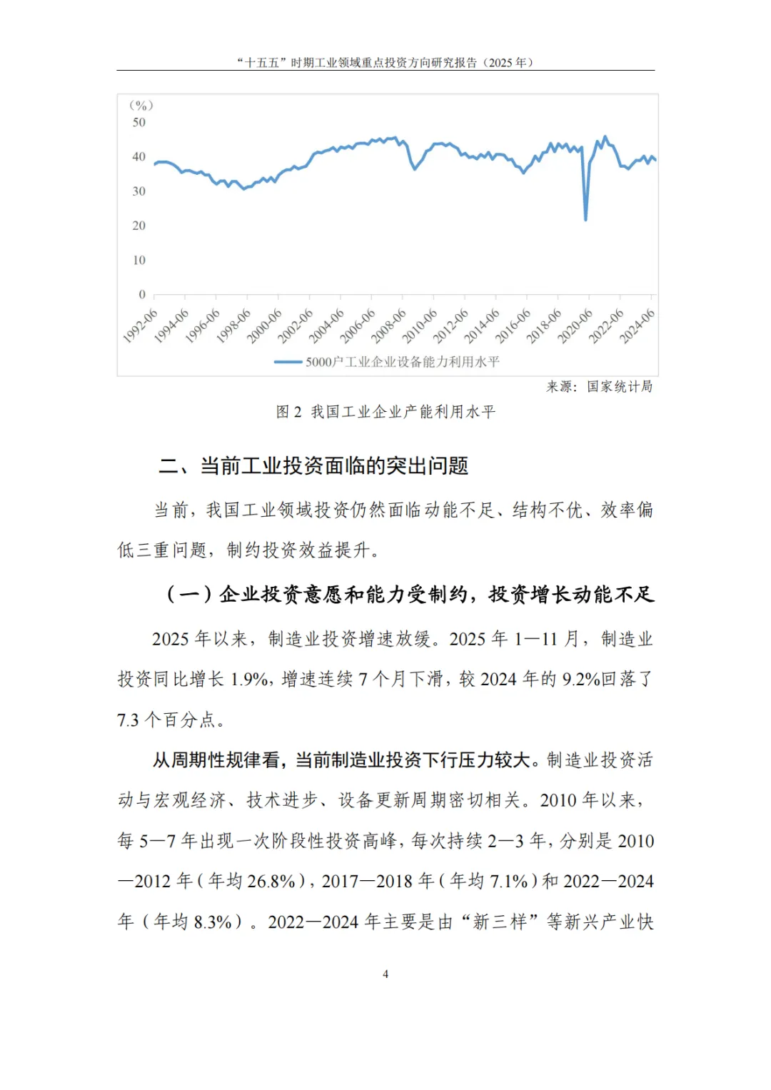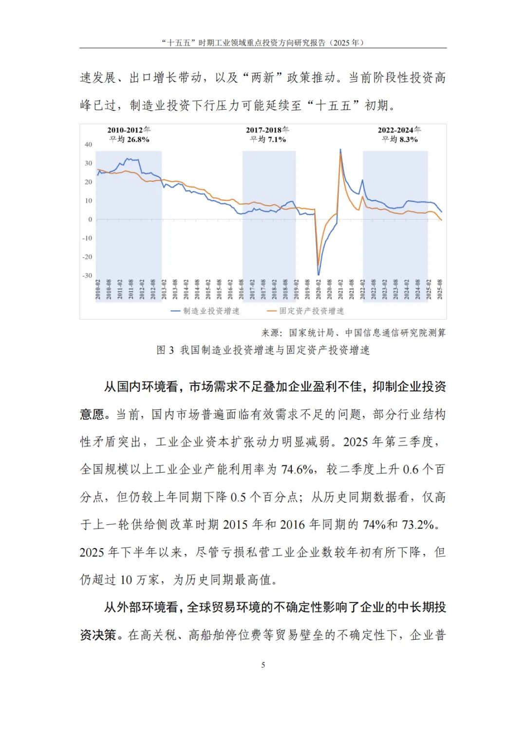 “十五五”时期,工业领域投资需适应新一轮科技革命和产业变革加速演进、全球产业链供应链加快重构等形势,以推进新型工业化重点任务为导向,保持投资合理增长、提高投资效益,支撑推动工业经济平稳运行、产业结构优化升级以及产业链供应链韧性与安全水平提升。